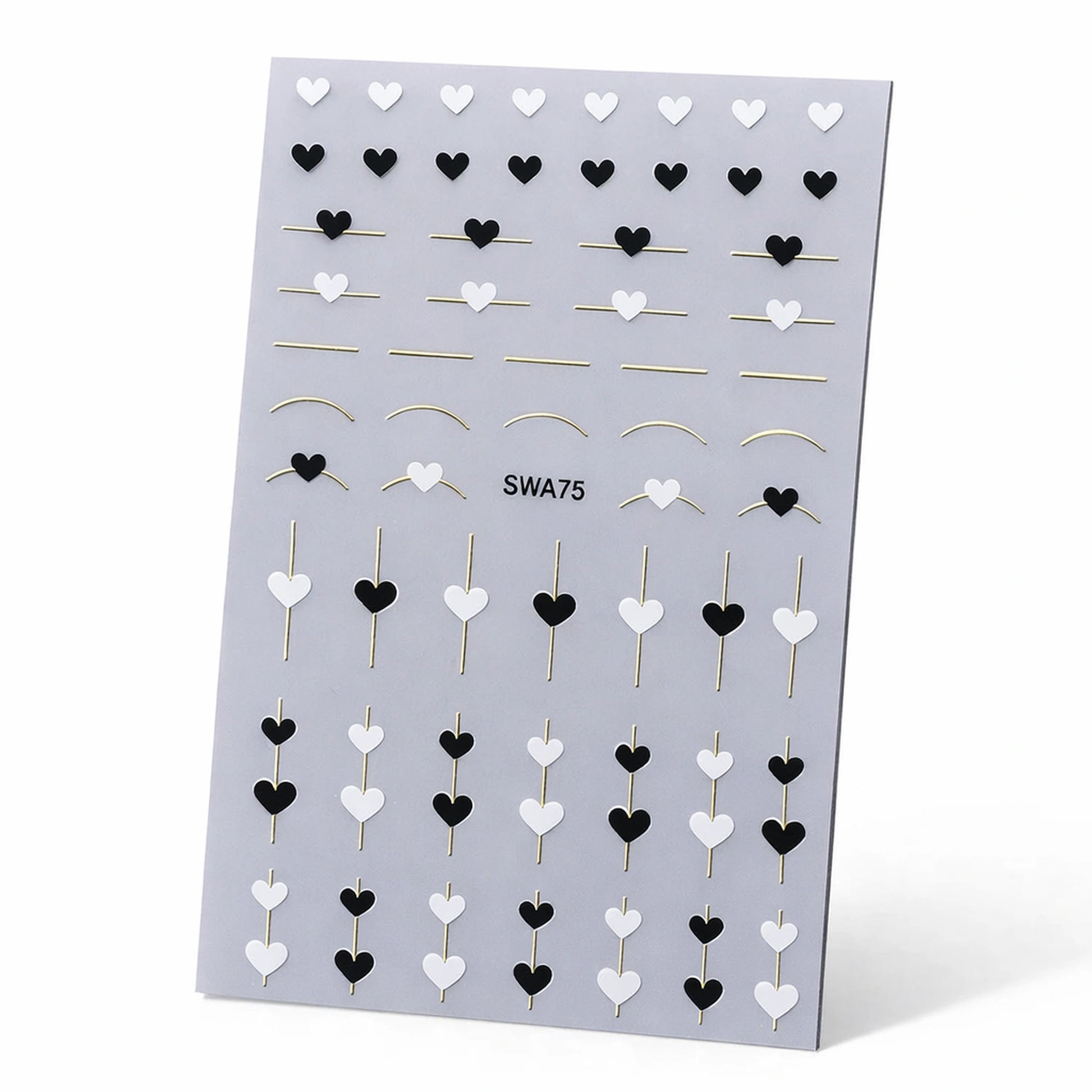 Gold Love Stripes to zestaw dwóch arkuszy złotych pasków 3D do zdobień paznokci z dodatkowymi czarno-białymi akcentami w romantycznym stylu. Połączenie metalicznego złota z kontrastującymi detalami tworzy elegancki, a jednocześnie nowoczesny efekt, który wyróżnia manicure.