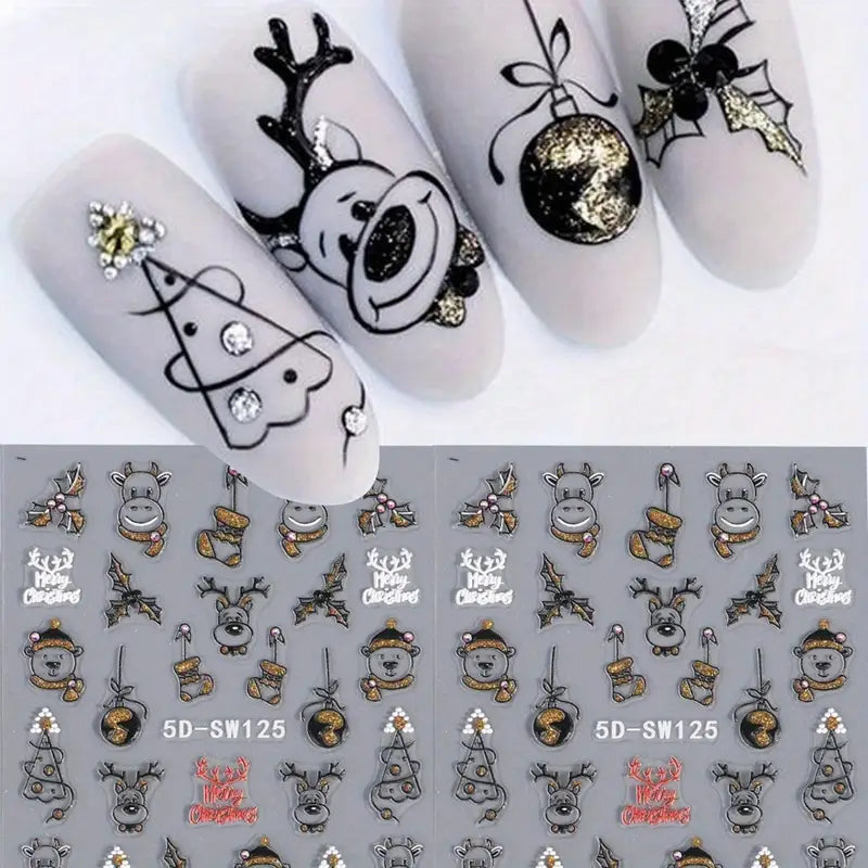 Golden Sparkle to świąteczne złote naklejki na paznokcie z uroczymi i dekoracyjnymi motywami inspirowanymi zimowym klimatem. Złote płatki śniegu, liście ostrokrzewu, gwiazdki oraz delikatne świąteczne postacie tworzą stylizację łączącą słodki charakter z eleganckim, świątecznym blaskiem.