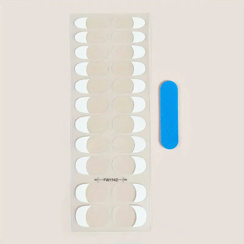 Jeden arkusz zawiera 22 naklejki do przedłużania paznokci, które umożliwiają kontrolę długości i kształtu stylizacji. Elastyczny materiał ułatwia dopasowanie do płytki paznokcia, a po utwardzeniu w lampie UV paznokcie można dowolnie opiłować i wykończyć zgodnie z wybranym stylem.