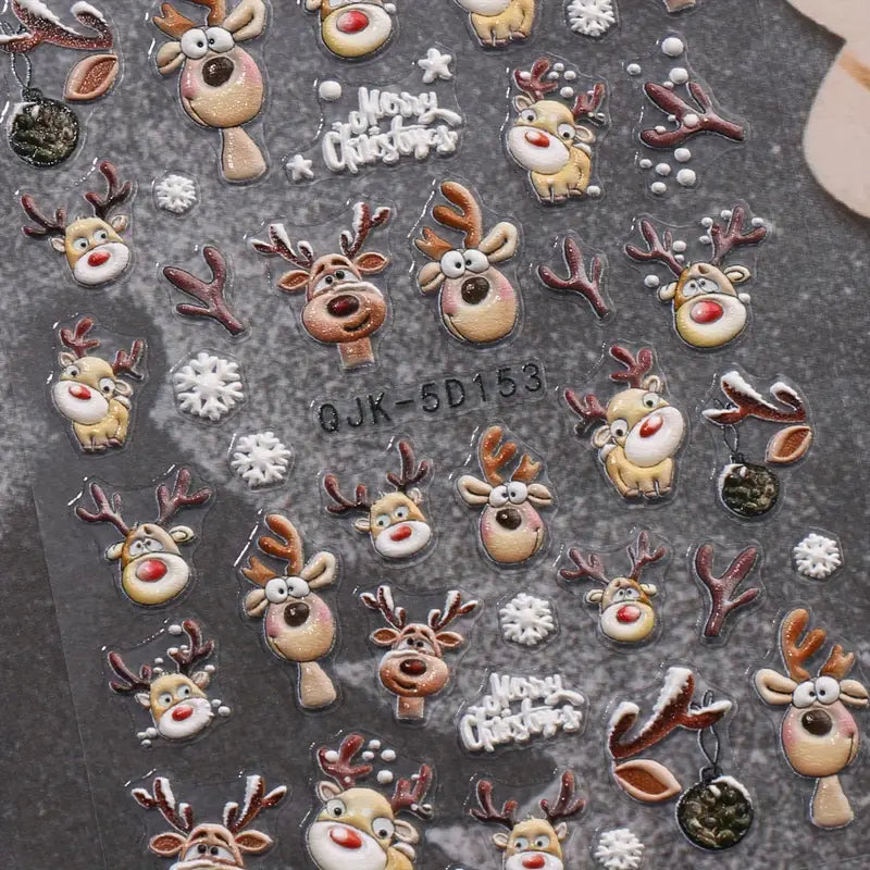Winter Sparkle Trio to zestaw trzech arkuszy świątecznych naklejek na paznokcie z zimowymi motywami, takimi jak śnieżynki, renifery i pierniki. Brokatowe akcenty oraz dekoracyjne detale nadają manicure wyrazisty, świąteczny charakter i subtelny połysk.