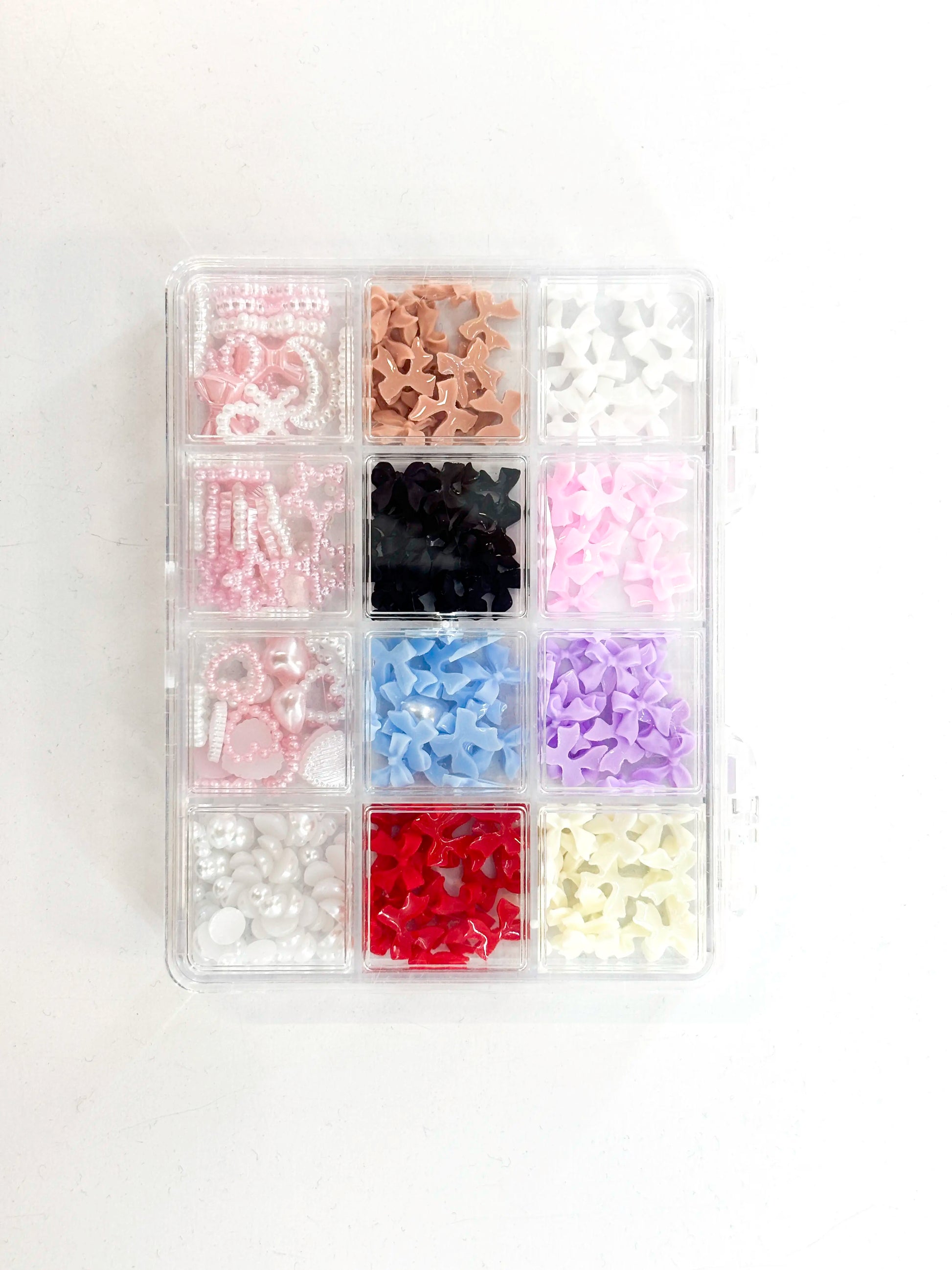 Profesjonalny zestaw zdobień do paznokci zawierający kokardki, perły oraz elementy dekoracyjne w różnych kolorach i kształtach. Idealny do tworzenia unikalnych stylizacji nail art.